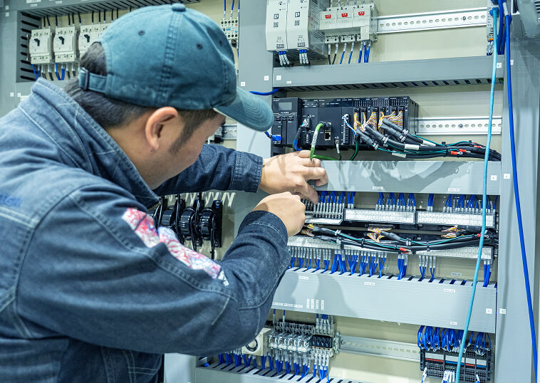 制御盤製作・機内配線・センサ・タッチパネル・PLCなどの接続と設定を行います。電気設計部門との連携により仕様に即した高信頼な制御システムを構築します。
