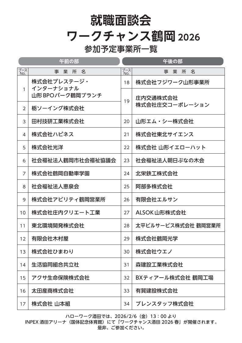 就職面談会「ワークチャンス鶴岡2026」に参加します